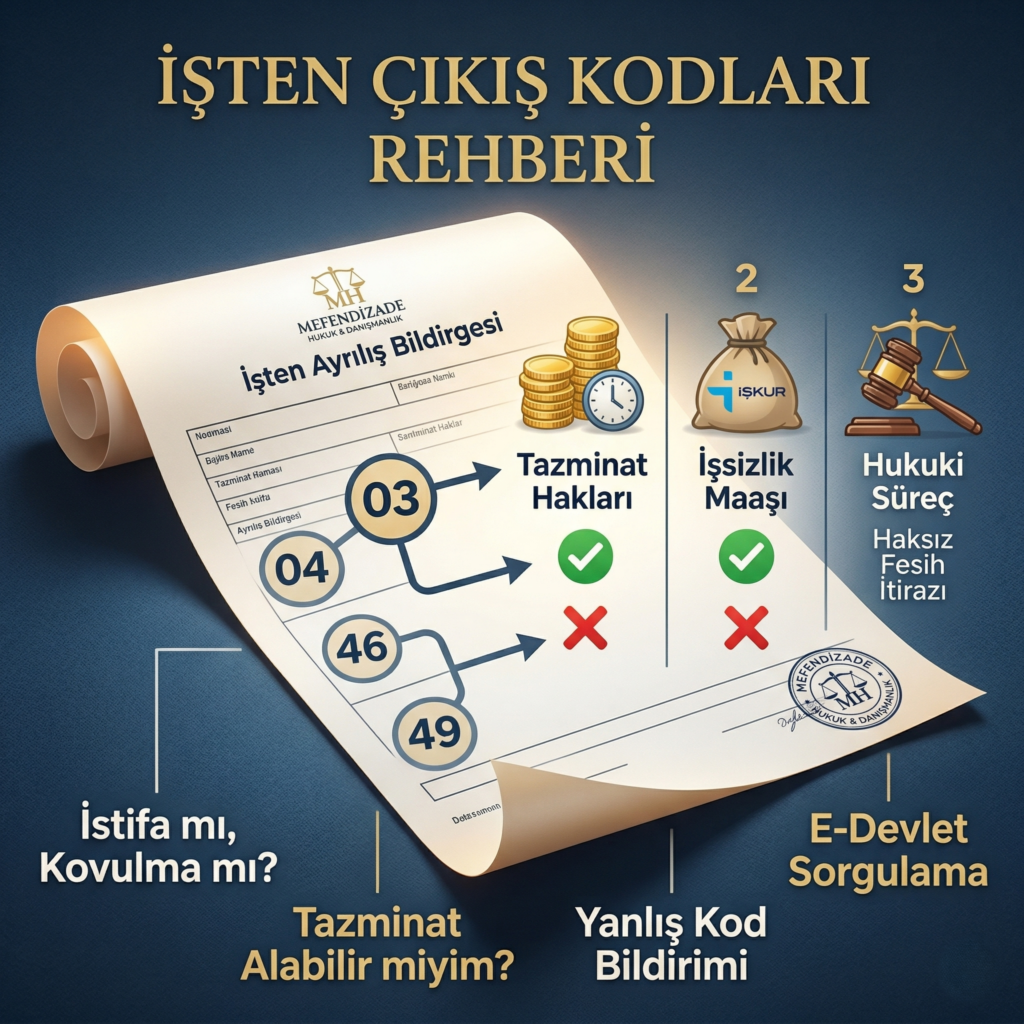 Özetle; işten çıkış kodunuz, emeğinizin karşılığı olan yasal haklarınızı alıp alamayacağınızı belirleyen en önemli resmi belgedir. Gerçeği yansıtmayan bir kod bildiriminde, hak kaybı yaşamamak adına konuyu uzman bir gözle değerlendirmek ve vakit kaybetmeden hukuki süreci başlatmak büyük önem taşımaktadır. Haklılığınızı ispat etmek ve yasal yollara başvurmak, iş avukatı ile iletişime geçmek maddi ve manevi mağduriyetlerin giderilmesindeki tek kesin çözümdür.