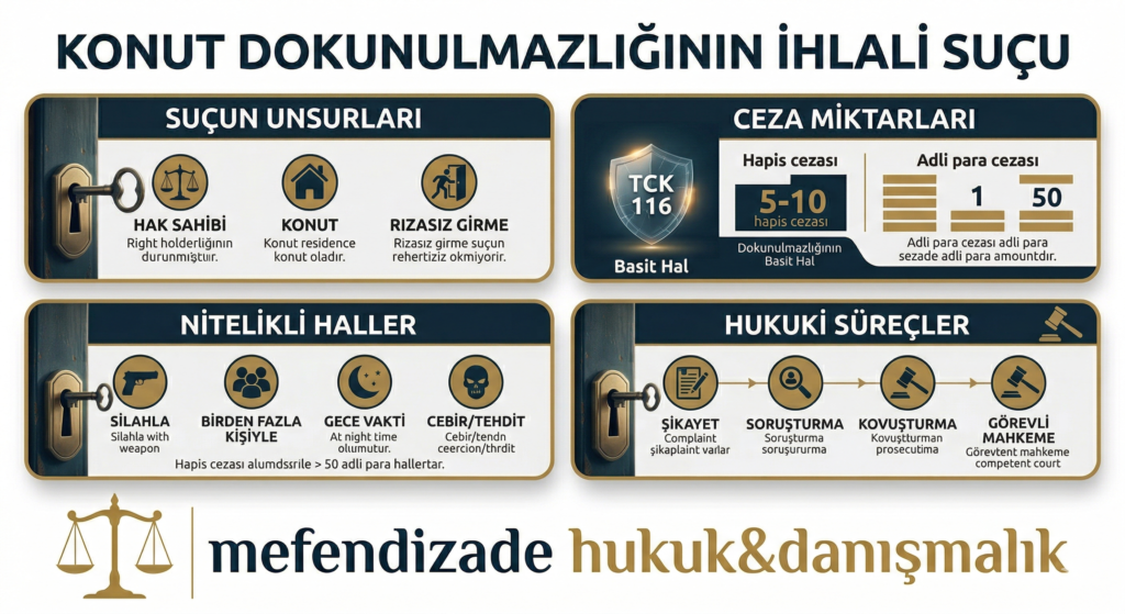 Halk arasında genellikle “haneye tecavüz” olarak bilinen konut dokunulmazlığının ihlali suçu, bireylerin en temel haklarından biri olan özel hayatın gizliliği ve güvenliğini koruma altına alan kritik bir hukuki düzenlemedir. Türk Ceza Kanunu’nun (TCK) 116. maddesinde düzenlenen bu suç tipi, kişinin yaşam alanına yönelik haksız müdahaleleri cezalandırmayı amaçlar.