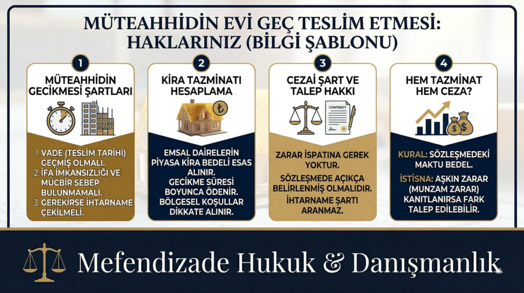 Türkiye’de gayrimenkul hukuku ve inşaat sektöründe en sık karşılaşılan uyuşmazlıkların başında, müteahhitlerin taahhüt ettikleri projeleri sözleşmede belirlenen tarihte teslim etmemesi gelmektedir. Gerek arsa payı karşılığı inşaat sözleşmelerinde gerekse ön ödemeli konut satış sözleşmelerinde müteahhidin evi zamanında teslim etmemesi, alıcılar ve arsa sahipleri için ciddi mağduriyetler yaratmaktadır.