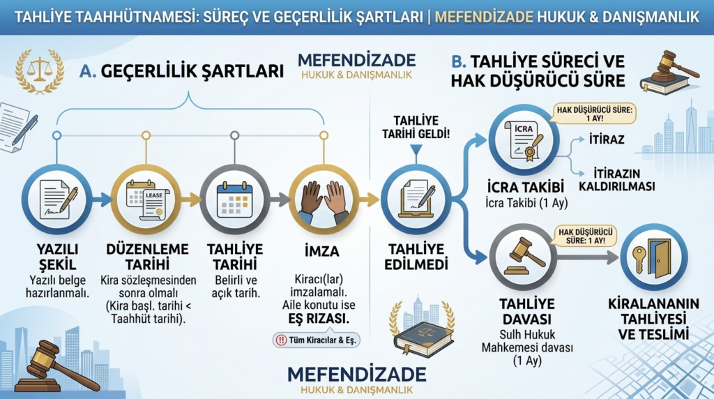 TBK m. 352 gereğince, sözlü olarak verilen tahliye sözleri hukuken hiçbir değer taşımaz. Taahhütname mutlaka yazılı olmalı; taşınmazın açık adresi, tarafların T.C. kimlik bilgileri ve tahliye tarihi net bir şekilde yer almalıdır.